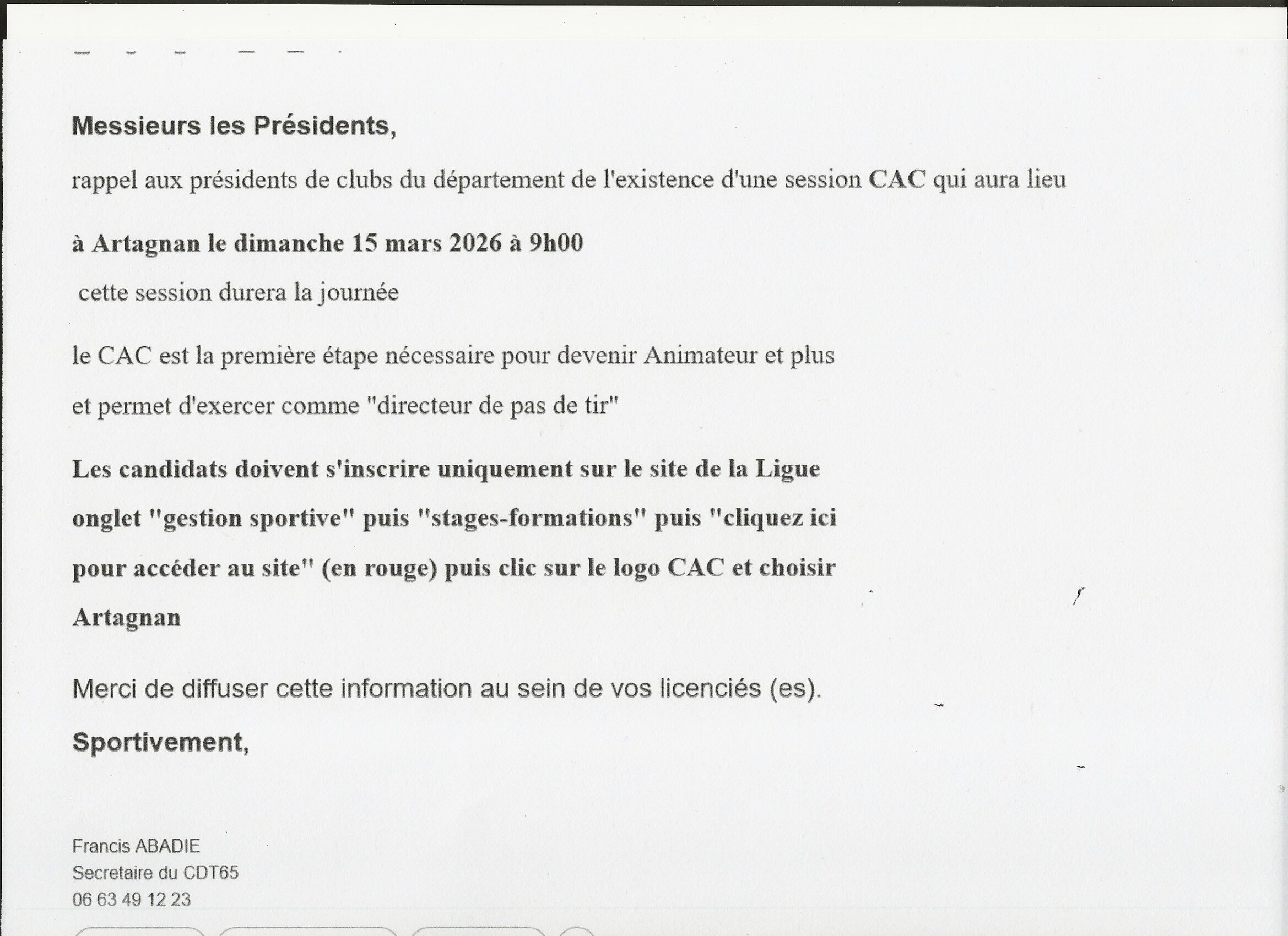 Le comité départemental rappelle qu'une session C A C se fera à Artagnan le dimanche 15 mars 2026. Voir le document ci-après.